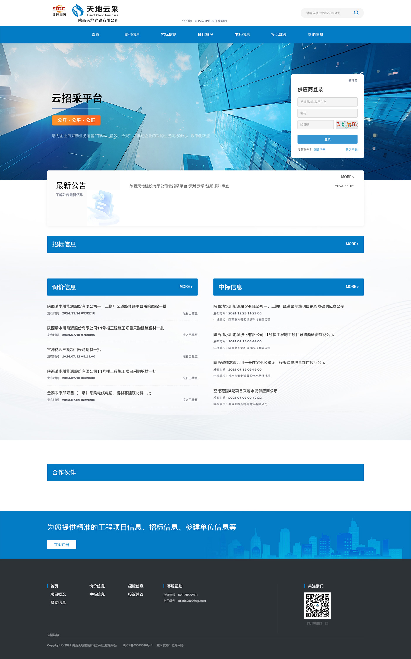 該平臺是一個(gè)綜合性的招采平臺,集成了詢(xún)價(jià)信息、招標信息發(fā)布、項目概況展示、中標結果公告、投訴建議受理、在線(xiàn)報名參與、企業(yè)基本信息提交以及在線(xiàn)注冊等多功能于一體。讓企業(yè)可以集中化的獲取企業(yè)報名和投標信息,為供應商提供一站式的招采服務(wù),為企業(yè)帶來(lái)了便捷、高效、全面的服務(wù)體驗。